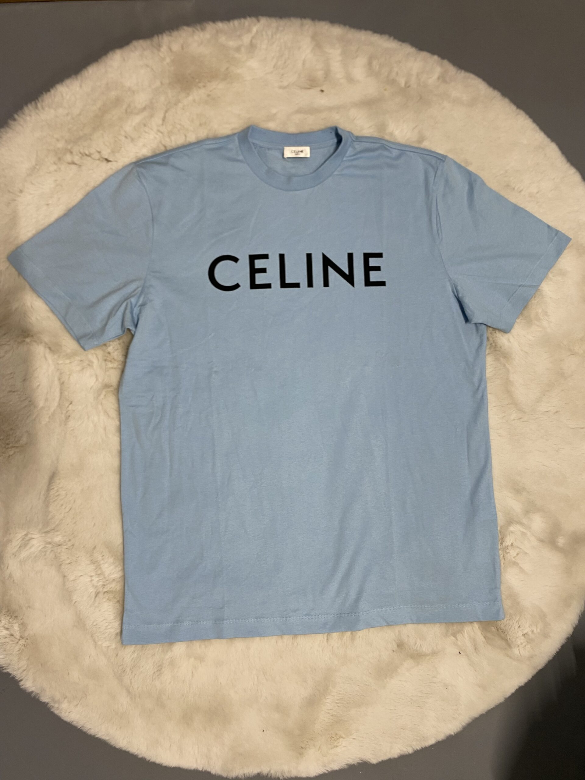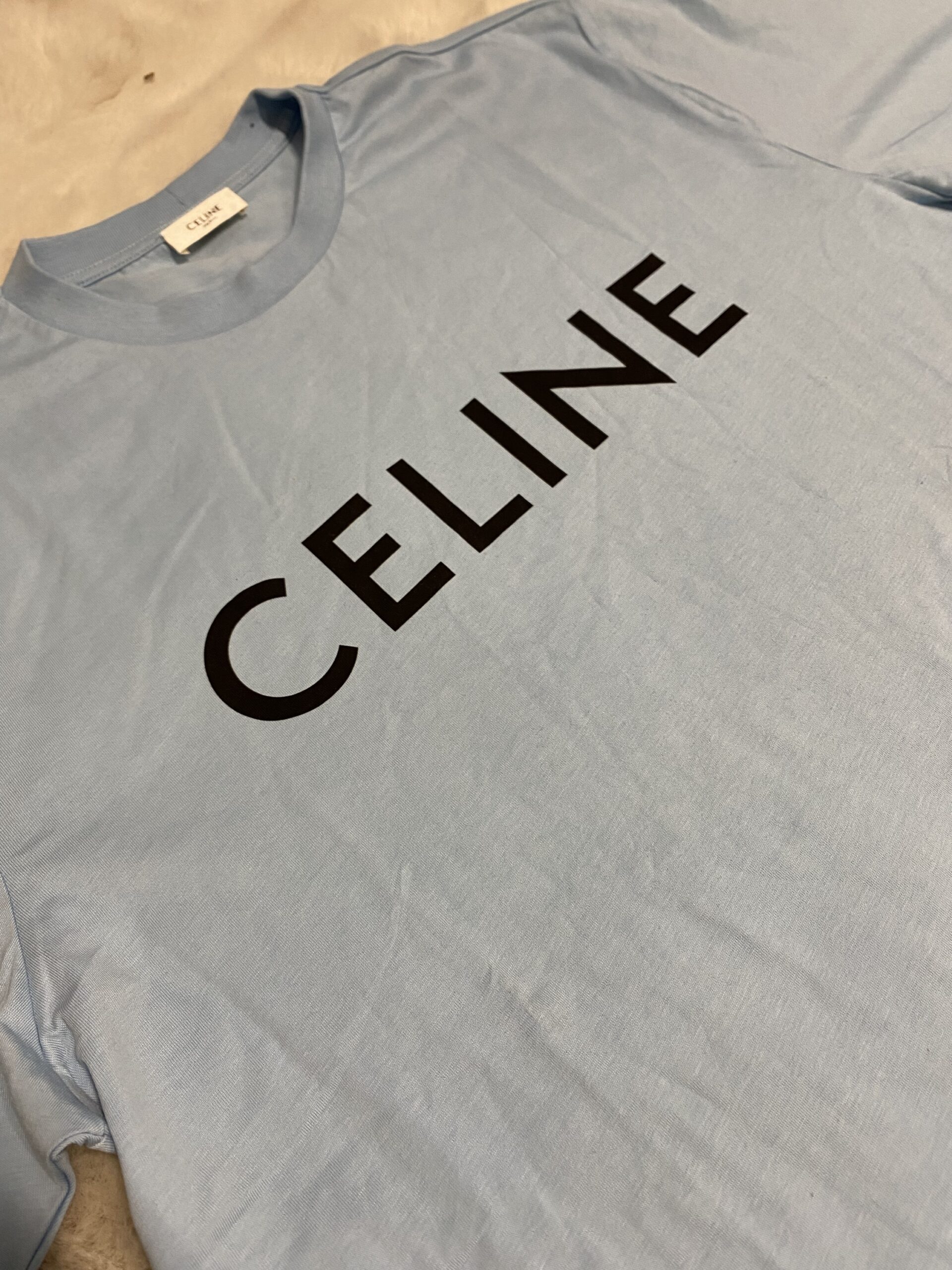 Celine T-Shirt Lichtblauw met Zwarte Bedrukking